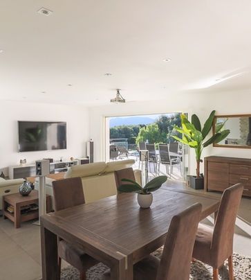 La maison s’ouvre sur une entrée menant à une spacieuse pièce de vie baignée de lumière, comprenant un salon-séjour convivial et une cuisine ouverte entièrement équipée, prolongée par un cellier. Les volumes ont été pensés pour une continuité naturelle vers l’extérieur, avec une grande terrasse et une piscine bénéficiant d’un panorama remarquable.