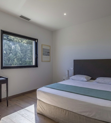 La partie nuit propose quatre chambres, toutes aménagées en suites avec salle d’eau et sanitaires. Certaines disposent d’un accès direct aux espaces extérieurs, renforçant la sensation de continuité entre intérieur et extérieur.